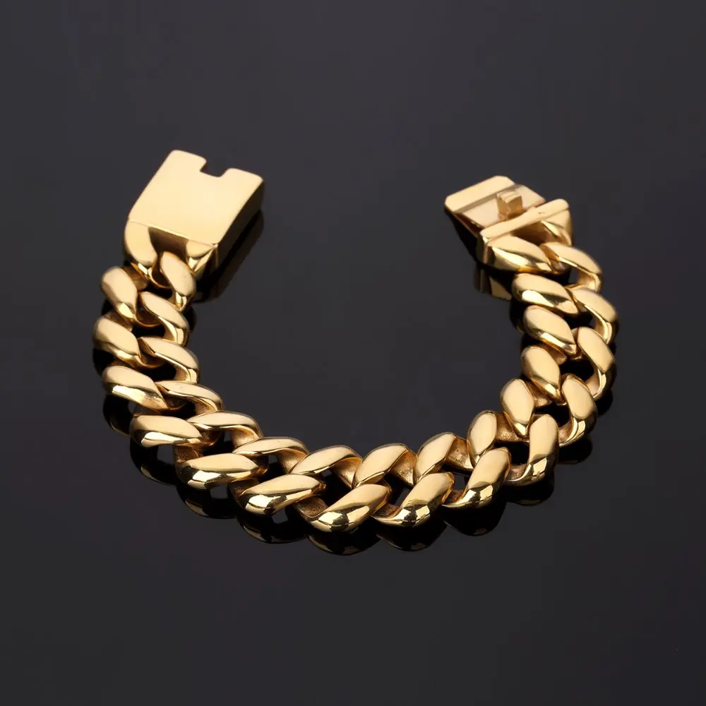 BEST QUALITY 20mm Hip Hop Bling Golden Ultra Stainless Steel Bracelets Rock Motorcycle Hand Chains Jewelry Wrist